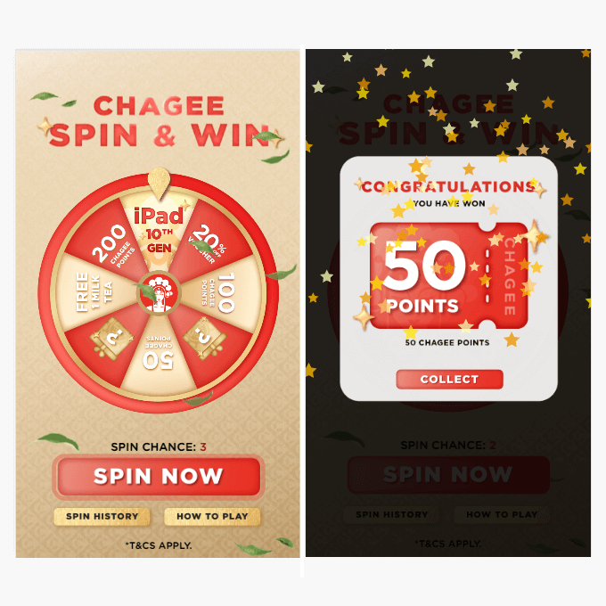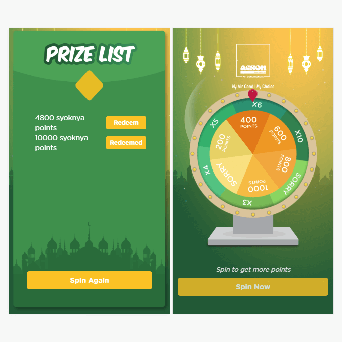 Dual wheels spin and win game with registration, wheels, result, and points redemption