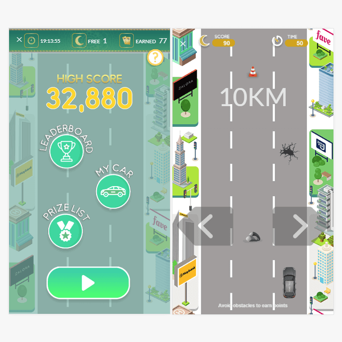 Arcade obstacles dodging game with score result, prize draw, leaderboard, and prize list